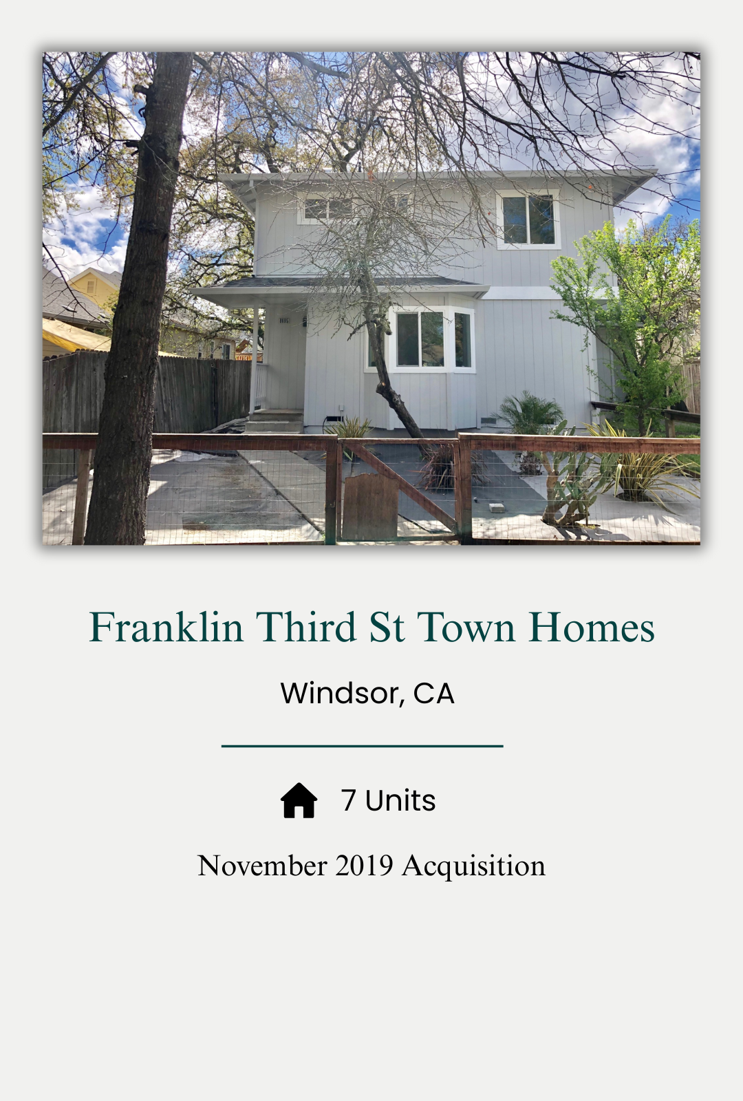 A rare value-add acquisition in a supply-constrained market, Franklin Third St. Townhomes offered significant upside through addressing deferred maintenance and repositioning under-market rents. During diligence, we uncovered further issues with maintenance and tenant quality, allowing us to successfully renegotiate more favorable terms. At closing, three units were delivered vacant, enabling immediate renovations, and we have since completed exterior upgrades and remodeled five of the seven units. This acquisition was made possible through our strong North Bay brokerage relationships, which were instrumental in bringing the deal across the finish line.